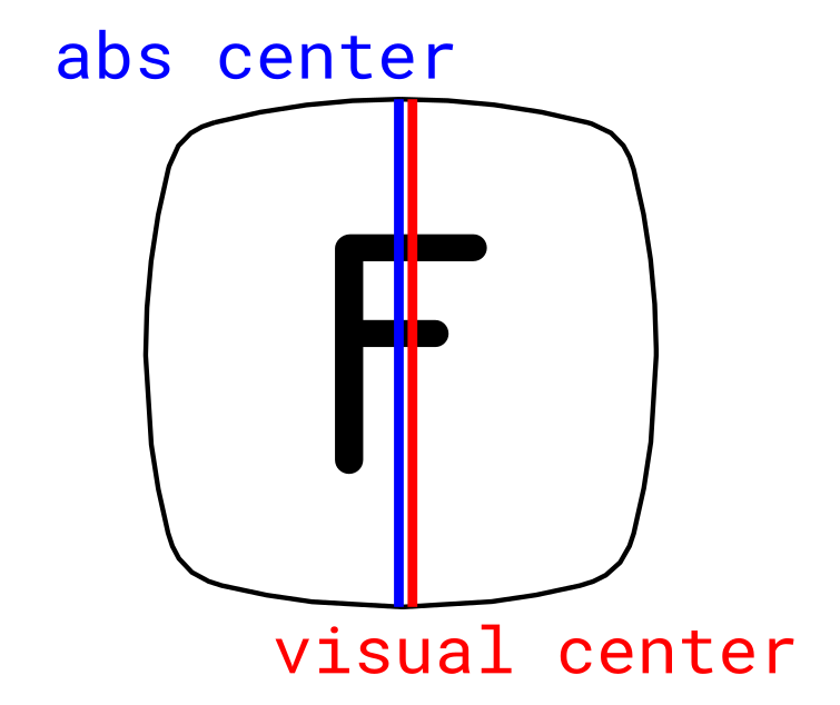 - Always align to the visual center not to the absolute center. Some letters (F, J, L, …) weight more on one side. You need to move the center to the left or right to counterbalance the visual weight (see picture)